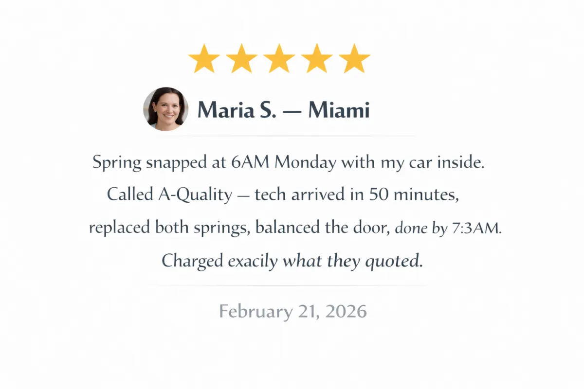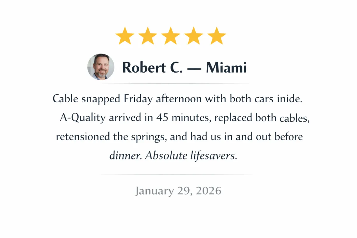 A-Quality Garage Doors provides five core services: spring repair and replacement, opener installation and repair, cable replacement, commercial overhead door installation and service, and annual maintenance tune-ups. Emergency service is available 24/7 across Miami-Dade.
