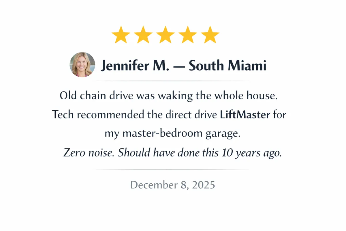 Yes. A-Quality Garage Doors carries LiftMaster and other major opener brands on every service truck. Same-day installation is available across Miami-Dade. The tech installs, programs all remotes, connects Wi-Fi, and walks through the myQ app before leaving.