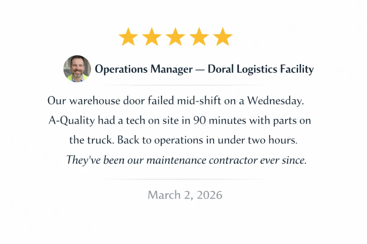 A commercial overhead door that fails is a direct operational cost - halted receiving, delayed shipments, compromised security. A-Quality Garage Doors has served Doral's warehouse corridor and Miami-Dade's commercial properties since 1996 with installations, emergency repairs, and preventive maintenance contracts designed around your operational schedule.