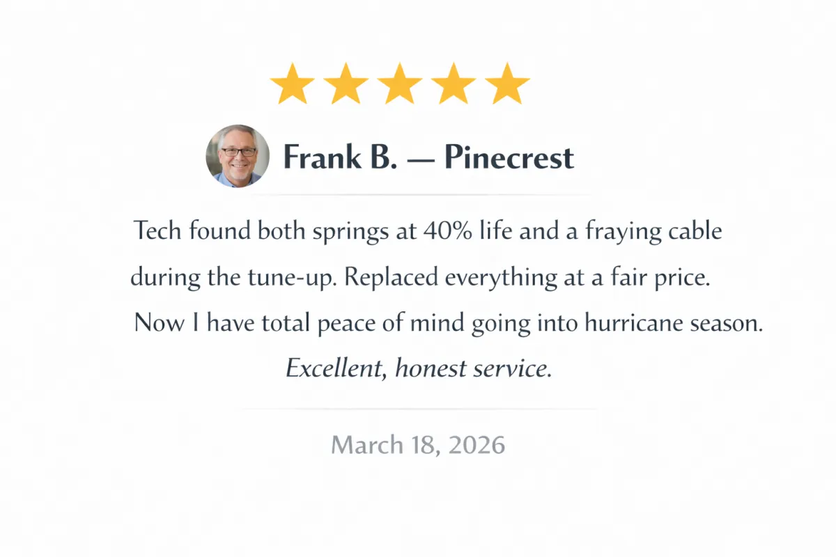 Every 12 months, minimum. Pre-hurricane season inspection is particularly recommended for Miami-Dade homeowners. If you've never had your door serviced, or if you just moved into a home, a baseline inspection is essential — you shouldn't inherit someone else's deferred maintenance.